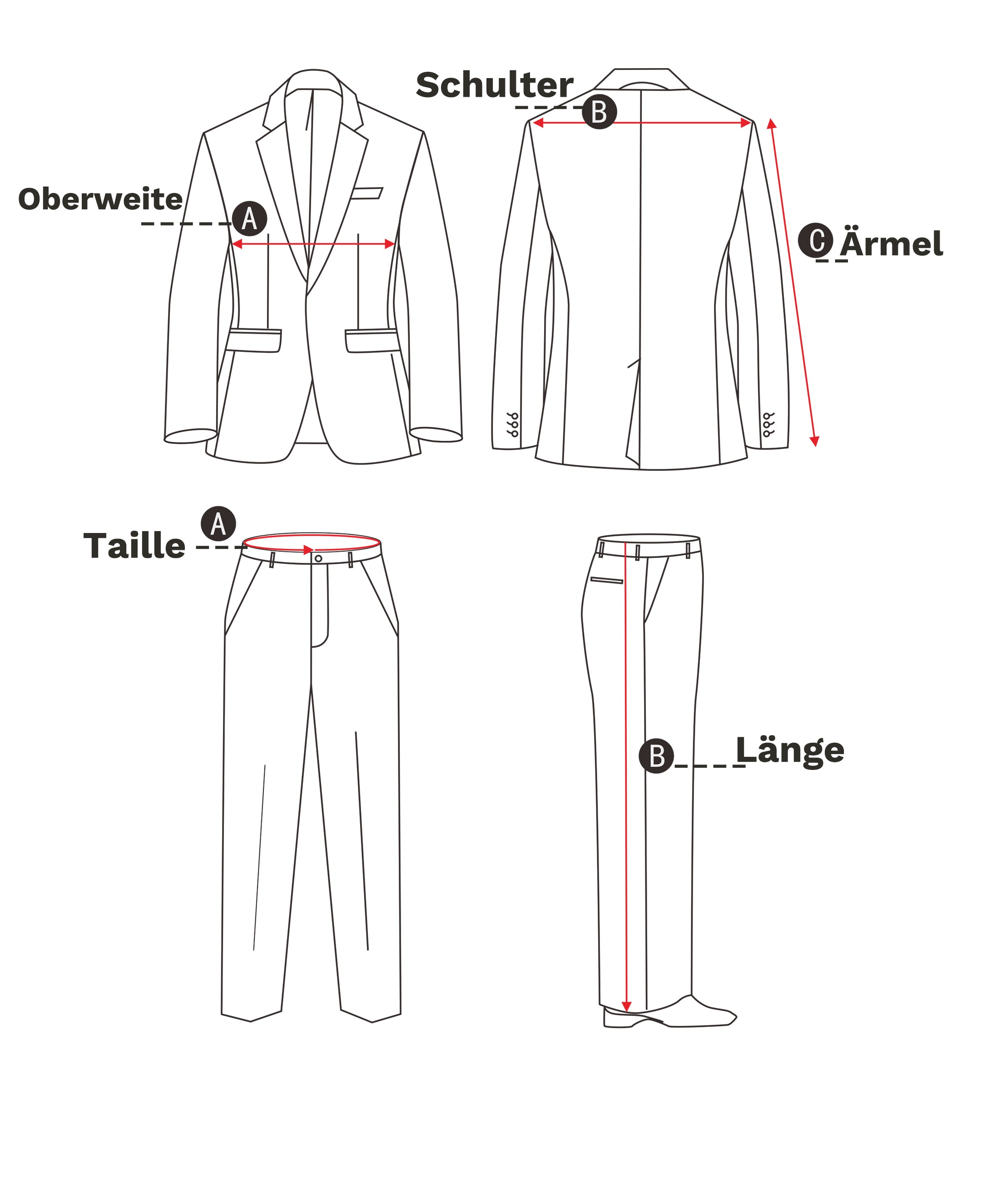 B-Länge: Messen Sie vom Bund bis zur Beinöffnung oder zum Saum.